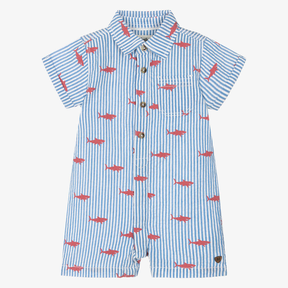 Cute blue and white striped shortie for baby boys by Hatley, made in lightweight cotton seersucker. With a red shark pattern, it is designed in a casual shirt style with decorative buttons and a patch pocket. It fastens with practical poppers on the front and between the legs for speedy dressing.