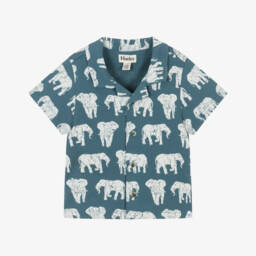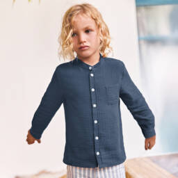 Casual navy blue and green tartan long-sleeved shirt for boys by Canadian brand Hatley, made in super soft, brushed cotton. It has blue overstitching and a useful patch pocket on the chest, with a button and tab detailing around the back. It fastens with faux bone buttons on the front, pocket and cuffs.