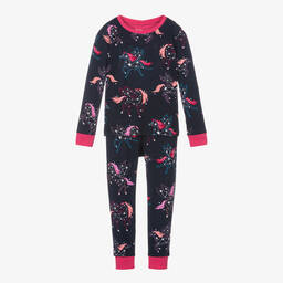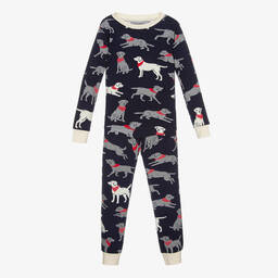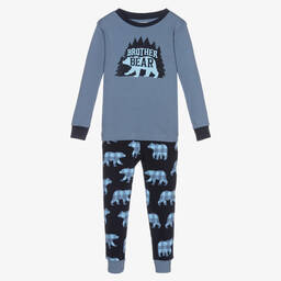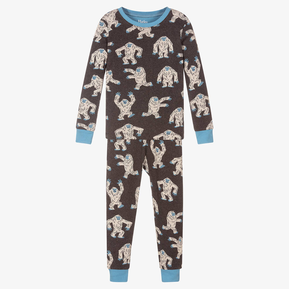 Charcoal grey pyjamas for boys by Hatley, made in soft organic cotton jersey. Designed to fit snugly, they have blue trims and a fun yeti print. There is a blue embroidered logo on the back of the neckline.