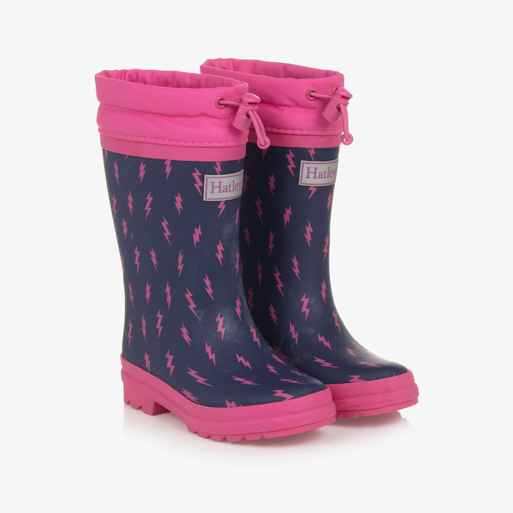 Navy blue rain boots for girls by Hatley, with a pink lightning bolt pattern. Lined in soft and cosy fleece, they have a smooth, padded trim around the top with a toggle-drawstring fastening for added protection from the elements. Made from flexible matte finish rubber, these practical boots have a light-reflective logo on the front, a cushioned, removable insole, and chunky rubber soles to help improve grip when walking through puddles.