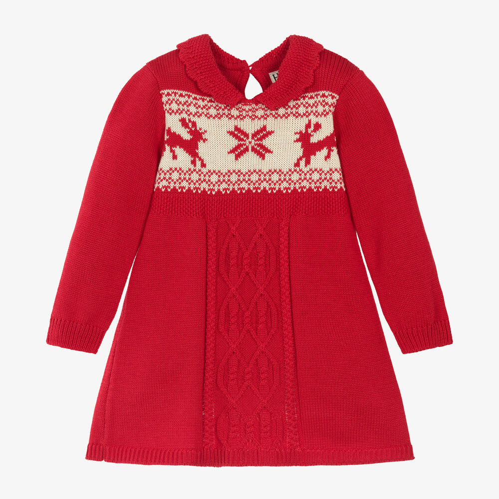 Sweet festive red dress for little girls by Canadian brand Hatley, knitted in a warm cotton and viscose blend. It has a traditional Fair Isle pattern across the chest, with reindeer and snowflakes. With moss-stitched detailing and a pretty, scalloped trim on the collar, there is a cable knit pattern on the front and a keyhole button fastening on the back.