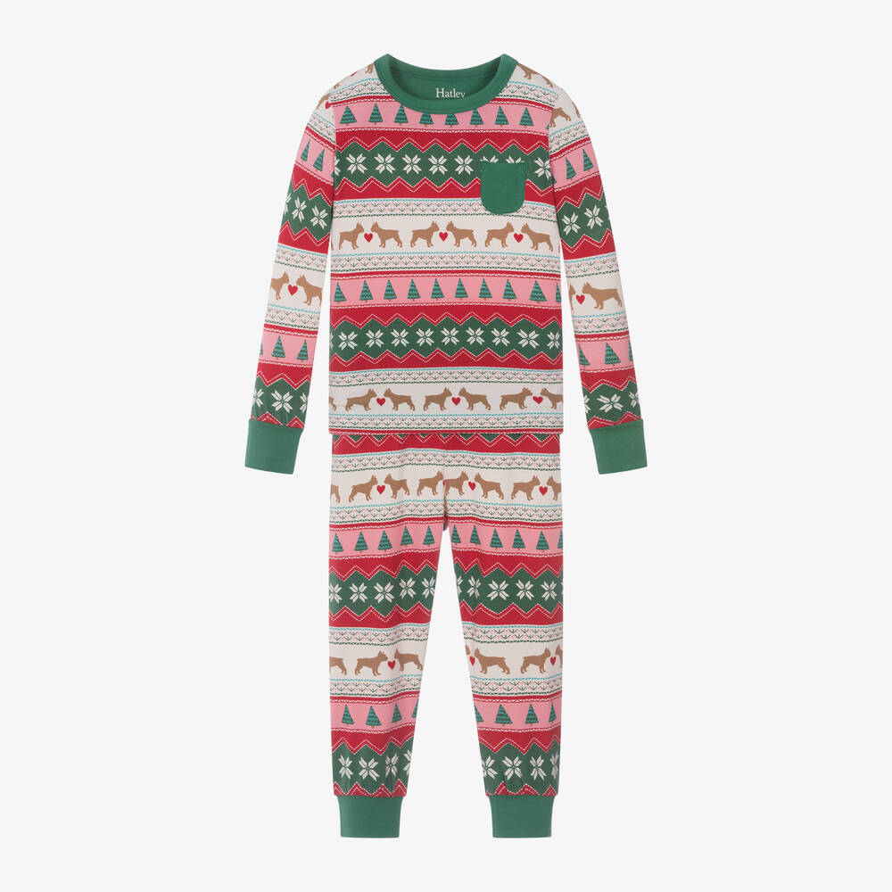 Festive long pyjamas for girls by Canadian brand Hatley, with a pink and green Fair Isle inspired print. They are made in super soft bamboo viscose jersey and are designed to fit snugly. Comfortable for sleeping or lounging, the top has a cute green chest pocket and the trousers have a gently elasticated waist.