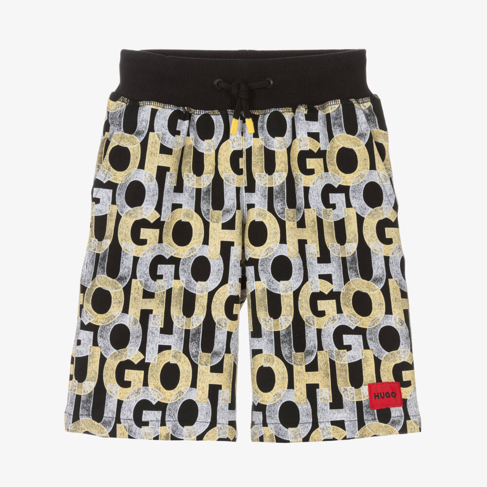 Black shorts for boys by HUGO, made in soft cotton jersey. Cool and comfortable, these Bermuda length shorts have slanted front pockets and a ribbed, drawstring waist for a great fit. They are patterned with instantly recognisable yellow and white monogram logos and have a red logo patch on one leg.