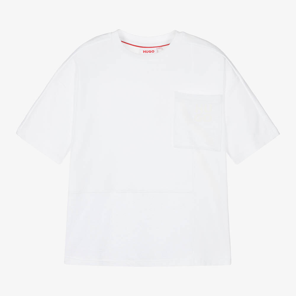 White T-shirt for boys by HUGO, made in soft cotton jersey. Comfortable and casual, with a boxy fit, it features panels on the front, back and sleeves in a soft, textured jersey with a brushed feel. There is a matching patch pocket on the chest with a white rubberised logo for a subtle branded finish.
