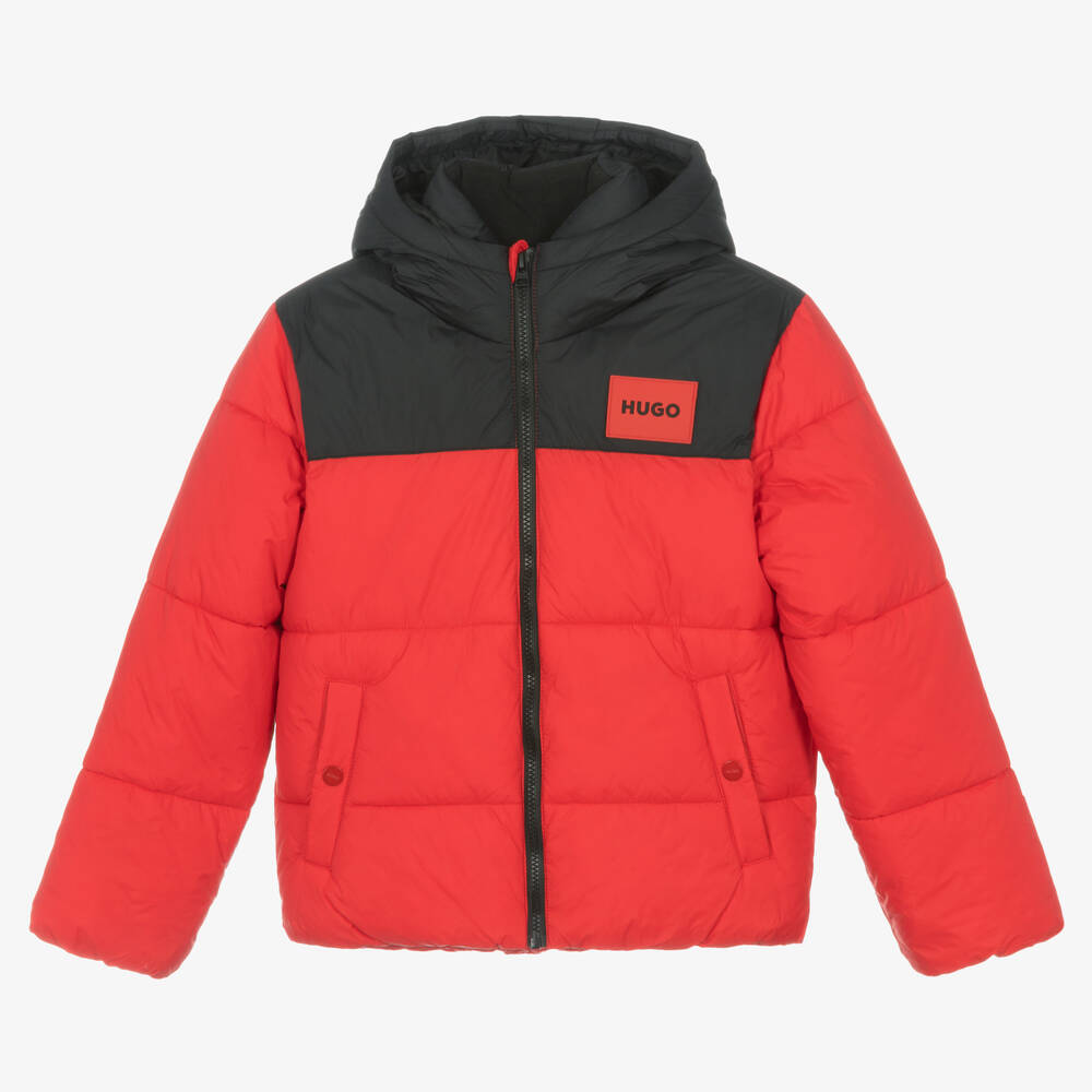 Red and black puffer jacket for teen boys by HUGO, with a distinctive rubberised logo patch on the chest in the brand's signature red. Warmly padded, it is made in a silky smooth fabric, with a fleecy neck lining and a large protective hood. Fastening on the front with an exposed black zip, it has fleece-lined pockets, with logo-embossed popper fastenings, for that extra branded touch. There is a useful, internal velcro fastening slip pocket for securing small belongings.
