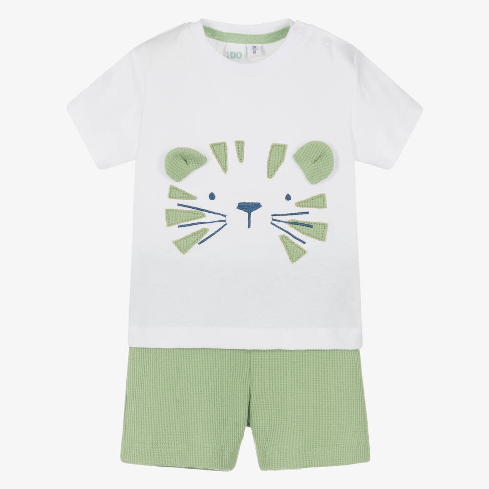 Adorable white and green cotton shorts set for baby boys by iDO Mini. Made in soft jersey, the T-shirt has a cute lion embroidered on the front with little 3D appliqué ears. The coordinating waffle jersey shorts have a drawstring elasticated waistband to ensure a comfortable fit.