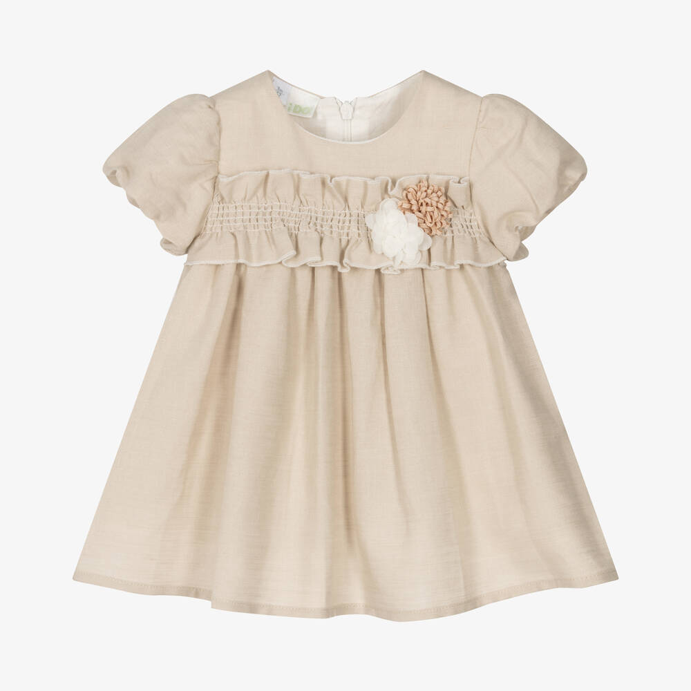 A charming beige dress for baby girls by iDO Mini, made in a lightweight linen and cotton blend. Lovely for a special occasion, it is trimmed on the front with a sweet ruffle and pretty floral appliqués. It fastens neatly with a zip on the back.