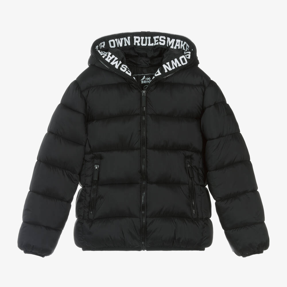Boys silky black waterproof puffer jacket by Italian brand iDO Junior. Beautifully warm, it is windproof, with a fixed hood, mid-weight padding, elasticated cuffs and a matching hemline to keep the cold out. The top part of the lining is in cosy fleece, whilst the lower part and hood are in comfortable satin. There is an eye-catching, grosgrain trim inside the front zip fastening and zip-edged hood, with 'Make Your Own Rules' repeat-printed in white. The jacket and useful front pockets fasten with a zip.