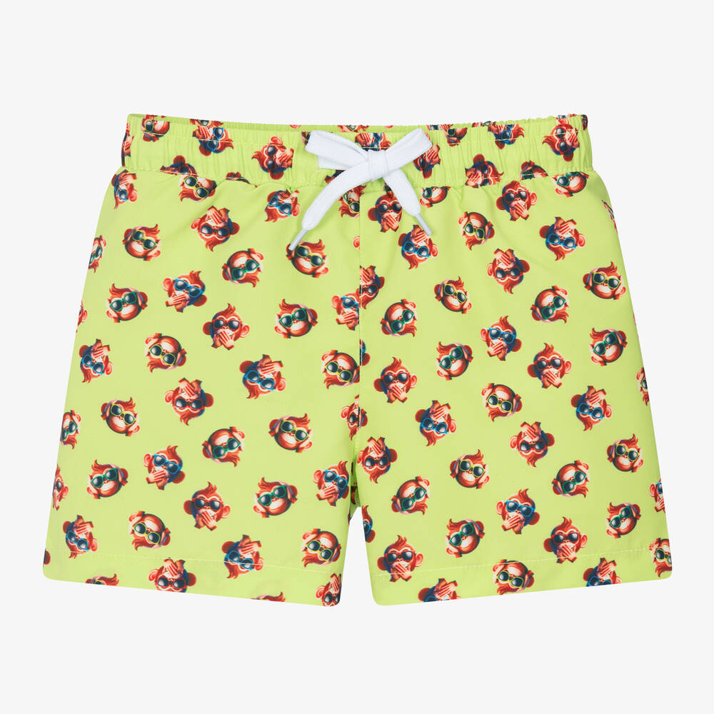 Bright lime green swim shorts for boys by iDO Baby, with a fun monkey pattern. Made in silky, lightweight fabric with a comfortable mesh lining, they have a drawstring waist for an adjustable fit.