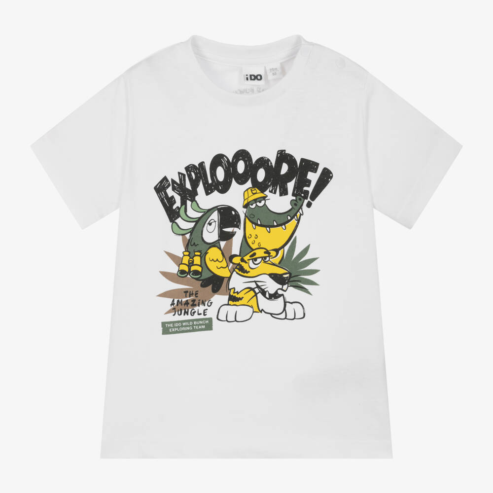 Boys white T-shirt from iDO Baby, with a jungle themed print and the word, 'Explooore!' in bold letters. It is made in soft cotton jersey, ideal for comfortable casual wear. Smaller sizes have popper fastenings on one shoulder for easy dressing.