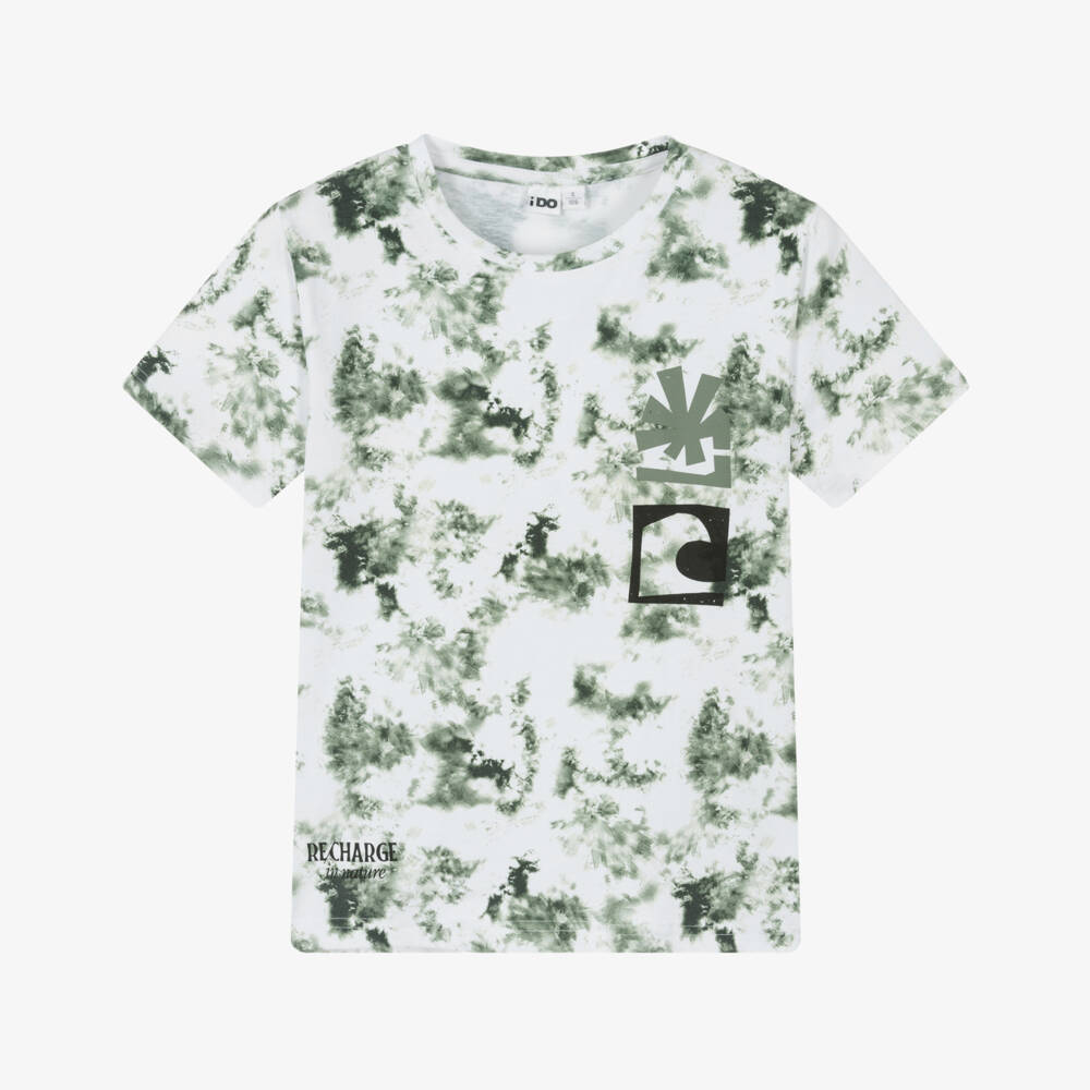 White cotton T-shirt for older boys by iDO Junior, with a green tie-dye effect pattern. Nature inspired, it is made in soft jersey with a casual crew neckline and cool graphic prints on the front.