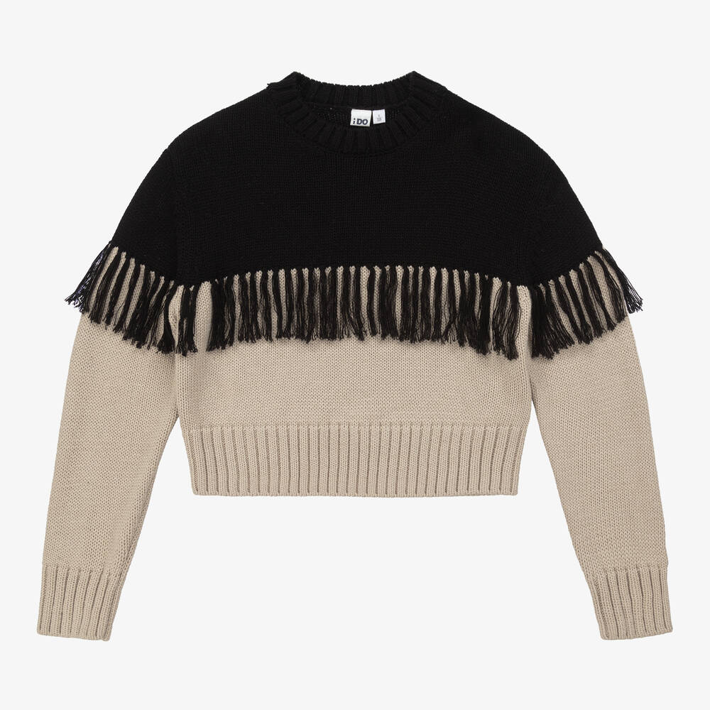 Black and beige two-tone sweater for older girls by iDO Junior. Knitted in a soft cotton and wool blend, it has tassel appliqués on the front and back for a stylish look.