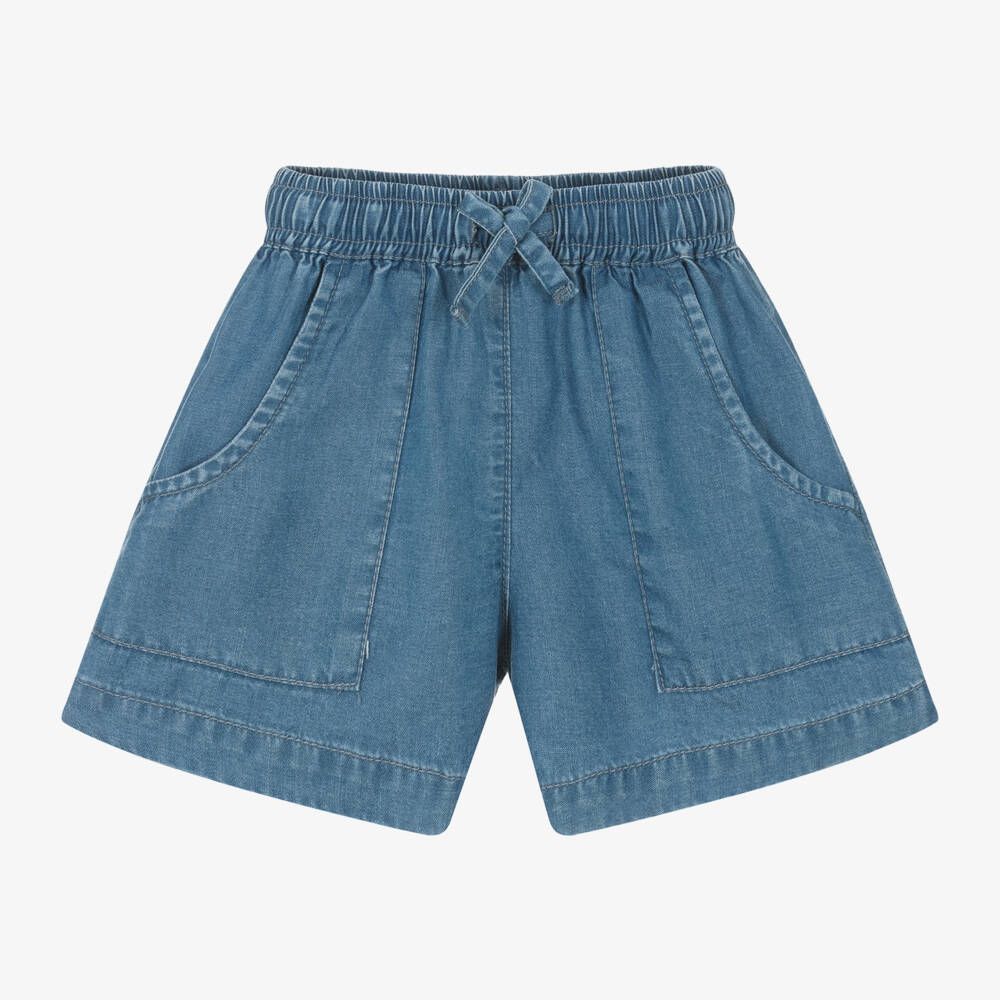 Casual blue shorts for girls by iDO Baby, made in soft, lightweight chambray. Designed with deep patch pockets on the front, they have a comfortable, elasticated waistband with drawstring ties to easily adjust the fit.