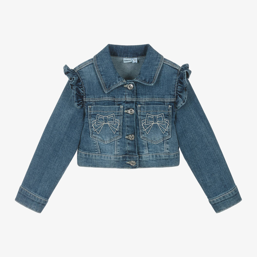 Short denim jacket for girls by iDO Baby, with added stretch for comfort. It has pretty ruffles on the shoulders and playful bows embroidered on the front patch pockets. There are branded silver metal buttons for fastening.