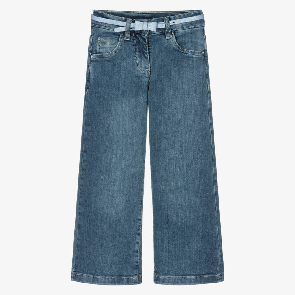 Girls blue wide leg jeans by iDO, made from soft cotton denim with a hint of stretch for comfort and flexibility. The jeans are adorned with charming bow details on the back pockets and come with a coordinating belt for added style. Fastening with a zip and button, they have an adjustable waistband for a great fit.