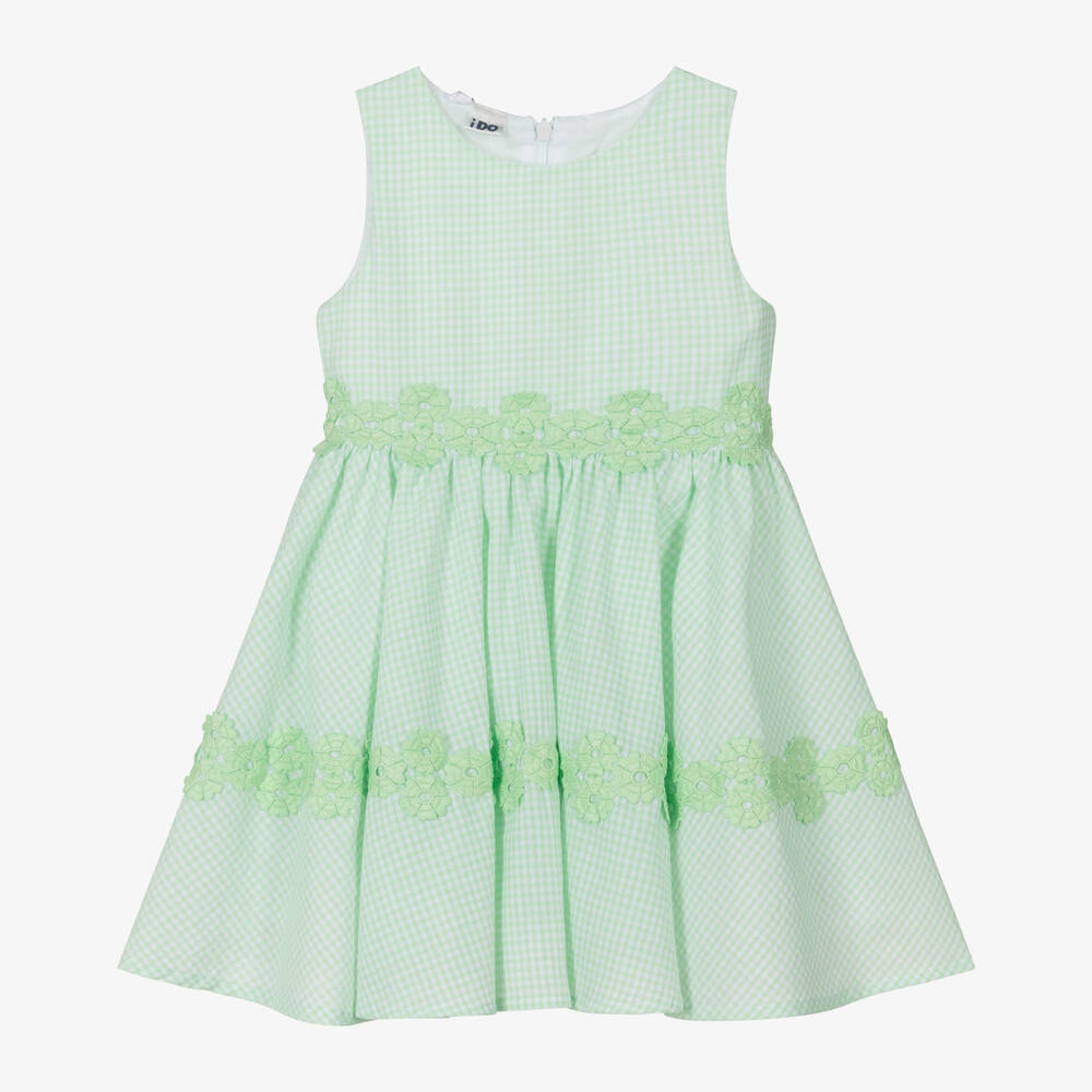 A lovely green gingham dress for girls by iDO Baby, woven in a lightweight cotton blend. This sleeveless style is decorated with pretty embroidered flower appliqués. Lined in lightweight cotton for comfort, it fastens neatly with a concealed zip on the back.