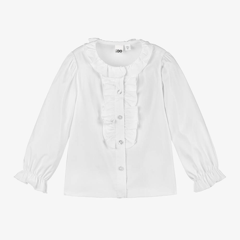 A charming white blouse for girls by iDO Baby, made from a smooth cotton weave. Fastening with pearlescent buttons on the front, it has pretty ruffled trims and a sweet frilled collar for a romantic look. The puffed long sleeves have gently elasticated fluted cuffs for added comfort.