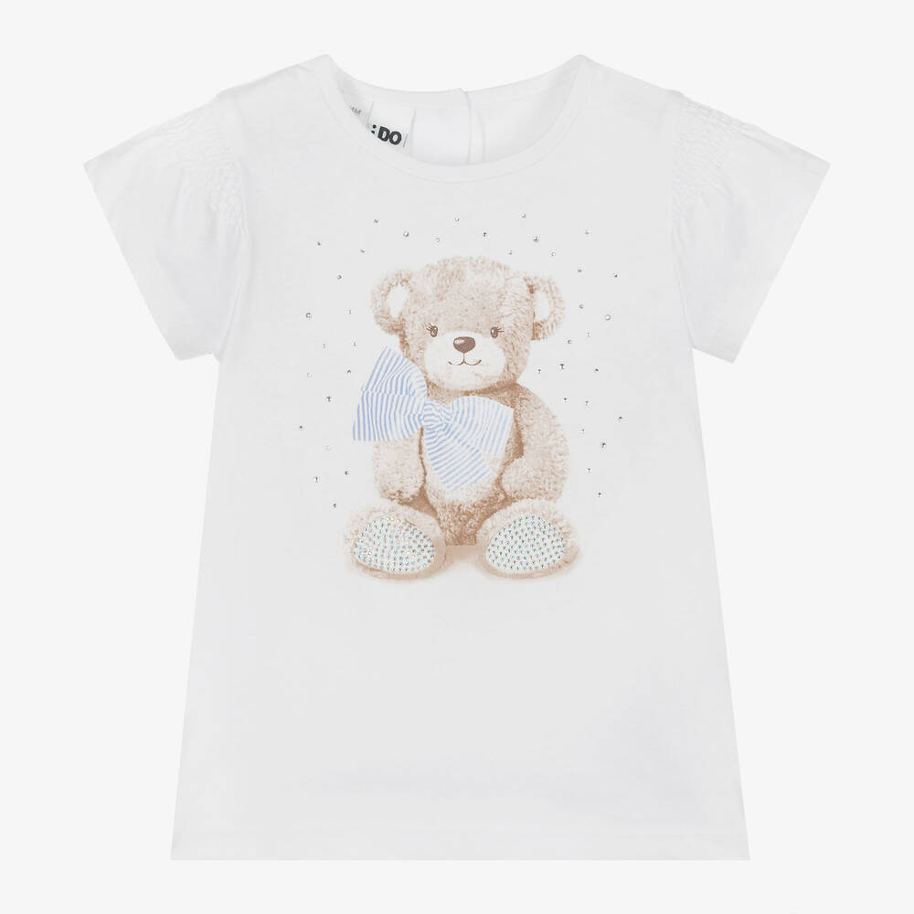 Super cute, this white T-shirt for girls by iDO Baby is made from soft cotton jersey. It has an adorable teddy bear design printed on the chest with a sweet blue and white striped bow and sparkly diamanté embellishments. There are shirred details on the short sleeves and pearlescent button fastenings on the back for a neat finish.