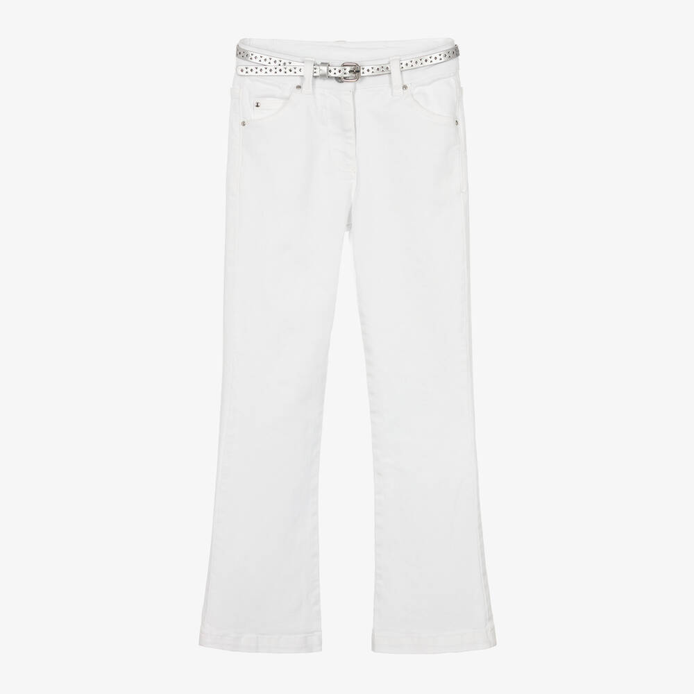 A pair of white jeans for older girls by iDO Junior, made in soft cotton denim with a slight stretch for comfort. Designed with a slightly flared leg, they have classic five-pocket styling and fasten with a button and zip on the front. An adjustable waist ensures a comfortable fit and for a stylish finishing touch, they come with a detachable metallic silver belt.