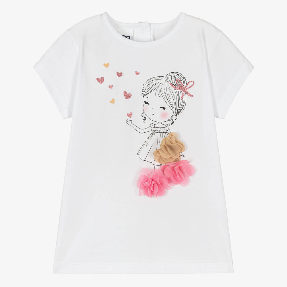 Beautiful white T-shirt for girls by Italian brand iDO Baby, made in the softest cotton jersey. It has a girl printed with glittery hearts and diamanté details, and 3D flowers appliquéd on the front. There are button fastenings on the back for a simple, easy-to-wear style.