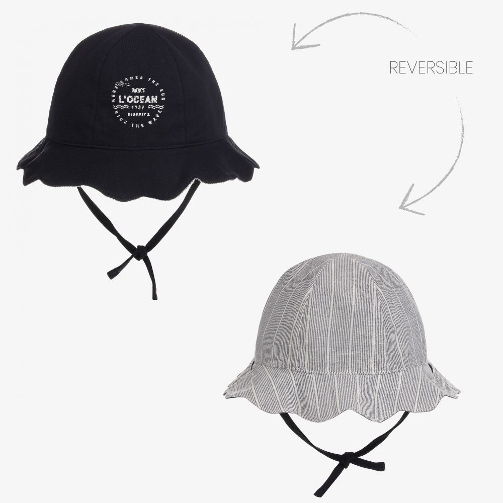 Baby girls navy blue and ivory reversible sun hat from IKKS, with a pretty scalloped brim. One side is made in navy blue cotton jersey, with a white distressed logo print. The reverse side is in soft cotton, with blue, ivory and glittery silver stripes. It has fabric ties that fasten under the chin.
