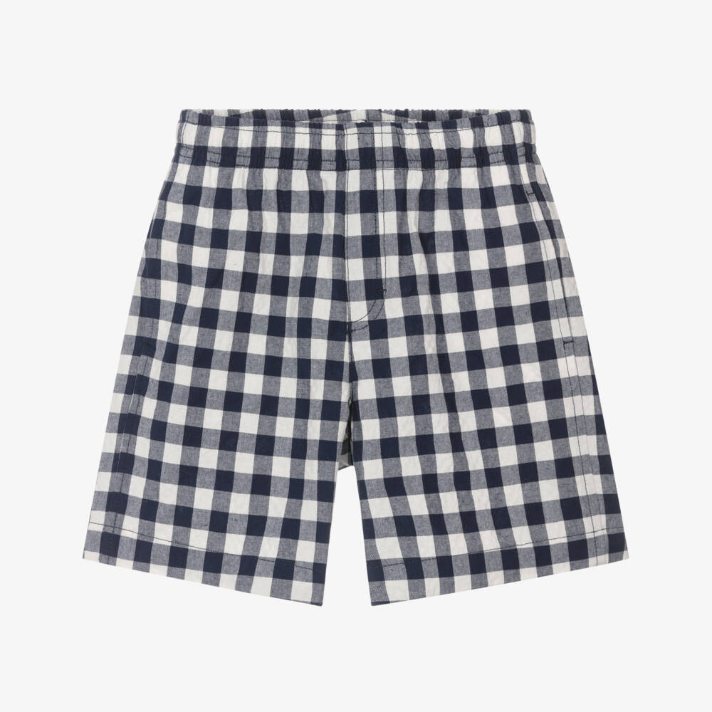 Navy blue and white check shorts for boys by Il Gufo, made in a soft cotton blend. This easy-to-wear style has an elasticated waistband with an internal drawstring tie for an adjustable fit. Concealed side seam pockets and a single back pocket add a practical finish.