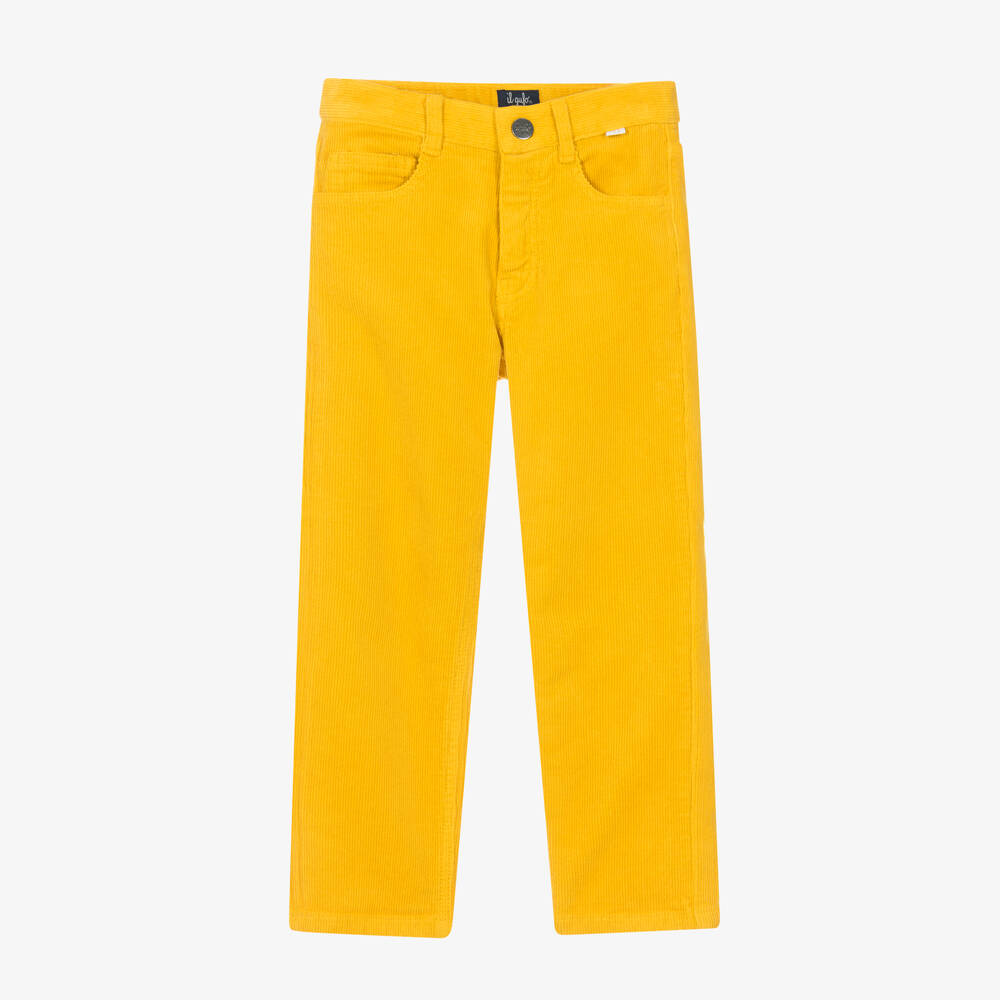 Yellow corduroy trousers for boys by luxury Italian brand Il Gufo. Made in soft cotton with a hint of stretch, they are super comfortable to wear. In a classic five pocket style and fastening with a zip and branded popper, they have an adjustable waistband that is gently elasticated around the back.
