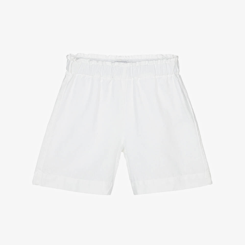 White linen shorts for girls by luxury Italian label Il Gufo. Ideal for warm weather styling, these comfortable lightweight shorts are easy to wear, with an elasticated, frilled waistband.