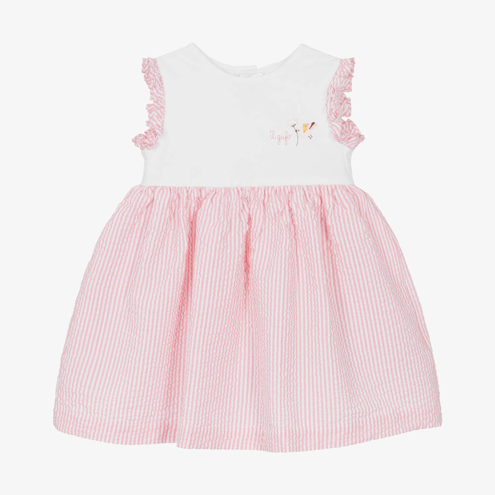 Cute cotton dress for little girls from luxury Italian brand Il Gufo. The white jersey bodice has an embroidered bird and logo for a delicate designer touch. For a graceful style, the striped seersucker skirt is slightly flared.