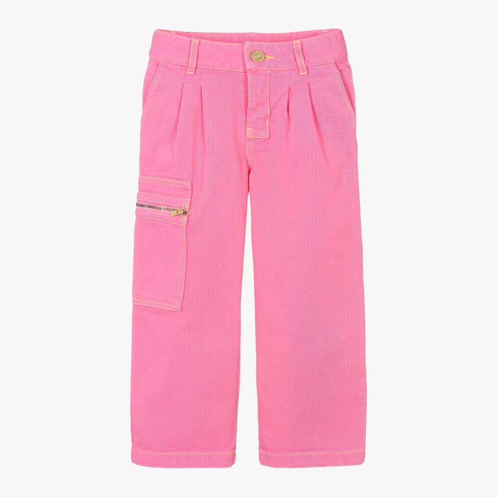 Stylish and modern for girls, these straight-fit pleated front trousers from Jacquemus Enfant are created in the designer's signature pink shade with contrast yellow stitching. They are made in comfortable cotton denim with slanted front pockets, back welt pockets and a cool, zipped patch pocket on one leg. Fastening with a zip and branded button, they have an adjustable waist for an individual fit. Branded metalware and a logo jacron on the back add a distinctive designer touch.