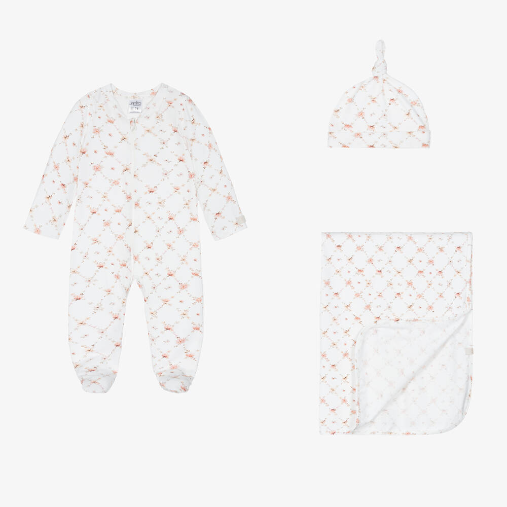 A babygrow set for girls from Jamiks, in white. Silky, soft and stretchy, all three pieces are made in bamboo viscose with a lovely pink floral pattern. The babygrow has a convenient front zip for quick dressing, the hat has an adorable knotted top and the blanket is useful for keeping baby snug and comfortable.