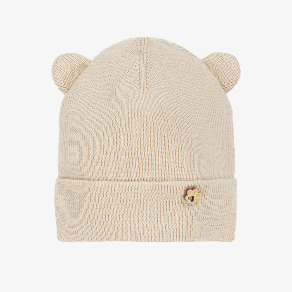 Adorable beige knitted hat for baby boys and girls from Jamiks, made in bamboo viscose for gentle-to-skin comfort. This cosy essential piece features cute little ears on the top and a decorative paw charm on the turned-up brim.