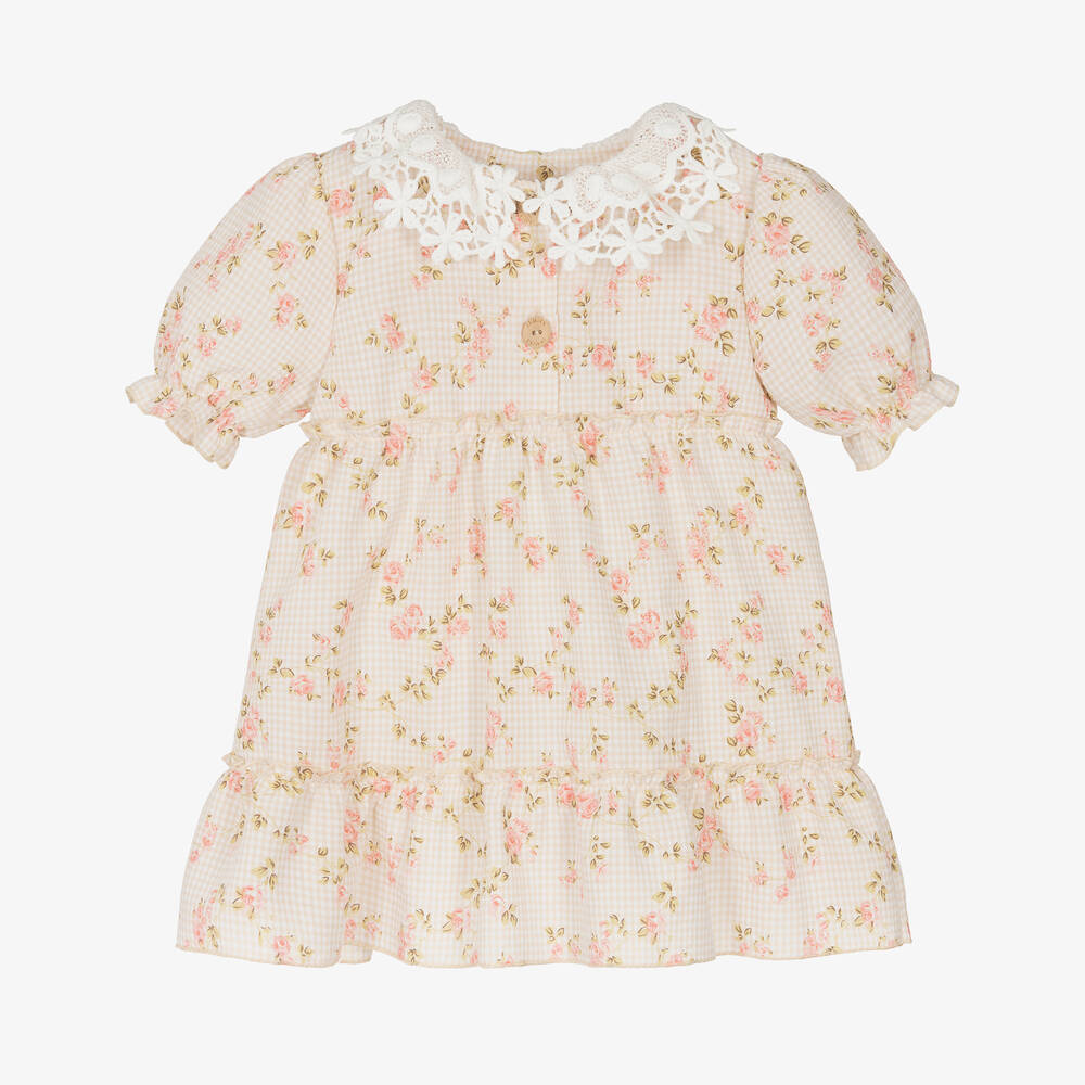 Charming beige gingham dress for younger girls by Jamiks, made in beautifully soft, lightweight seersucker. Trimmed with ruffles, it has a pink floral pattern, pretty puffed sleeves and a white guipure lace collar.