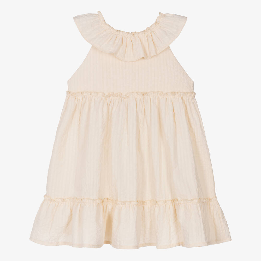 A lovely beige dress for younger girls by Jamiks, made from soft cotton seersucker. Lovely and lightweight for those warmer days, it has a ruffle neckline and pretty frilled trims. It fastens neatly with a stylish keyhole button on the back.