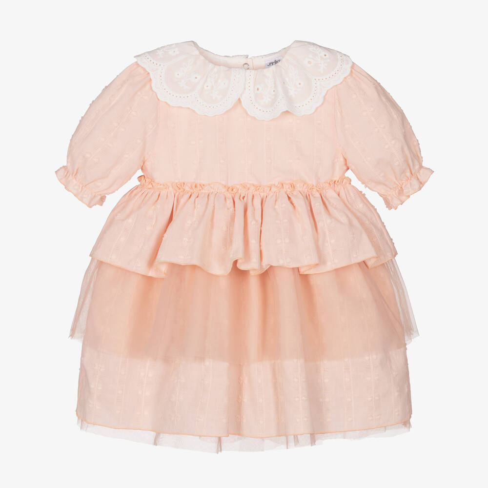A charming coral pink dress for younger girls by Jamiks, woven in a soft cotton blend with a lightly textured pattern. This traditional style has a white broderie anglaise collar, pretty puffed sleeves and popper fastenings. For a lovely full shape, the skirt is designed in tiered layers of soft tulle and cotton.