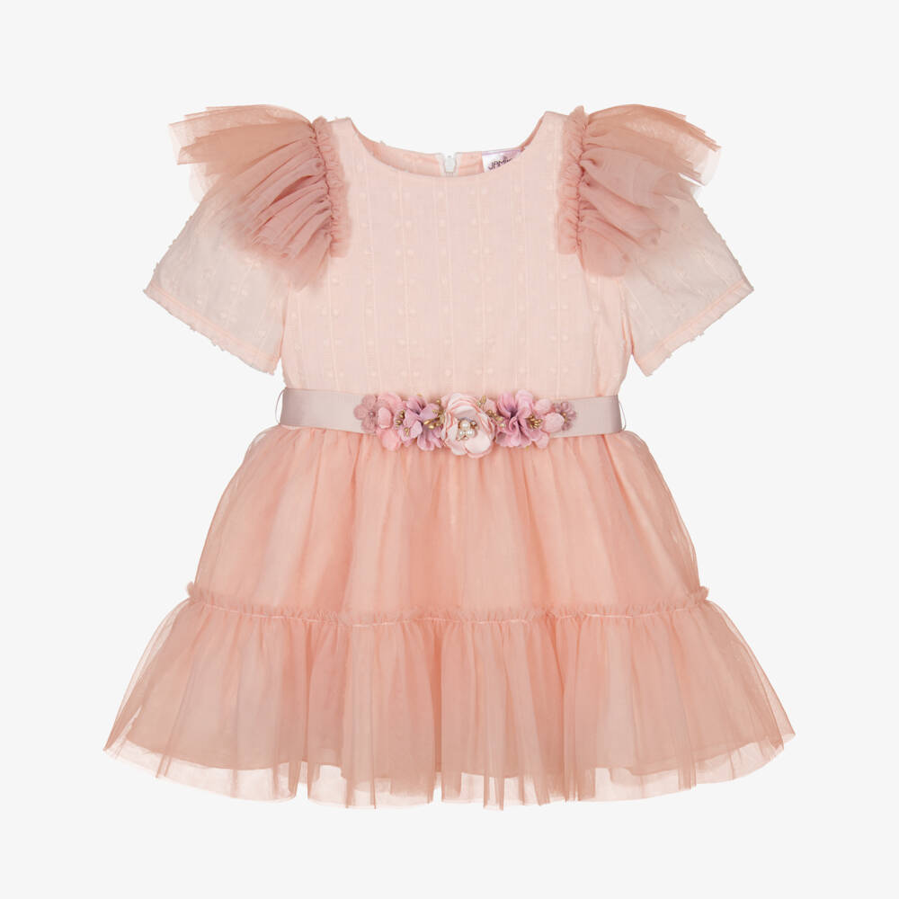 A beautiful pale pink dress for younger girls by Jamiks, woven in soft cotton poplin. Ideal for a special occasion, the skirt has a soft tulle overlay with a pretty frilled hem. Matching tulle ruffles trim the shoulders and the dress fastens with a concealed zip on the back. A detachable grosgrain sash with gorgeous 3D floral appliqués ties neatly around the waist for an elegant finish.
