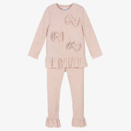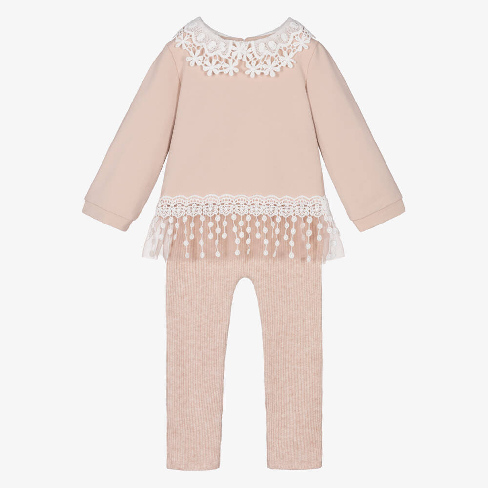 Dusky pink leggings set for girls by Jamiks. The pretty, cotton jersey top has a white guipure lace collar and a soft tulle and lace hemline, with a stylish keyhole button fastening on the back. A pair of comfortable leggings, made in a beautifully soft, ribbed viscose blend, completes this lovely outfit.