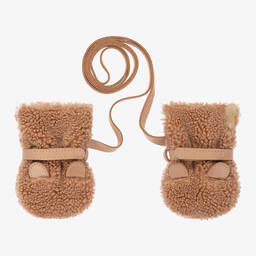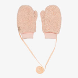 Pale pink bouclé mittens for baby girls from Jamiks. The beautifully soft ribbed cuffs and cotton jersey lining ensure they fit comfortably on tiny hands. The attached strap threads through the sleeves of their coat or jacket to keep the mittens safely together.