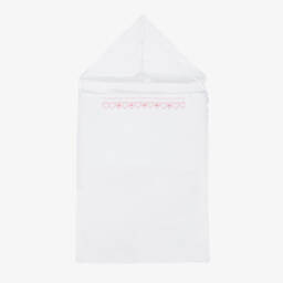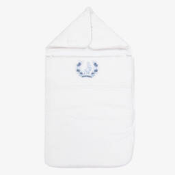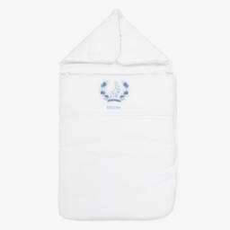 A lovely white cotton nest for baby boys and girls by Jamiks, with a textured woven check pattern and a pretty ruffle trim. Soft and cosy, it is gently padded and has an organic cotton muslin lining. Fastening with velcro and ties, this wrap-around style can be opened flat and used as a comfortable surface for your little one to lie on.