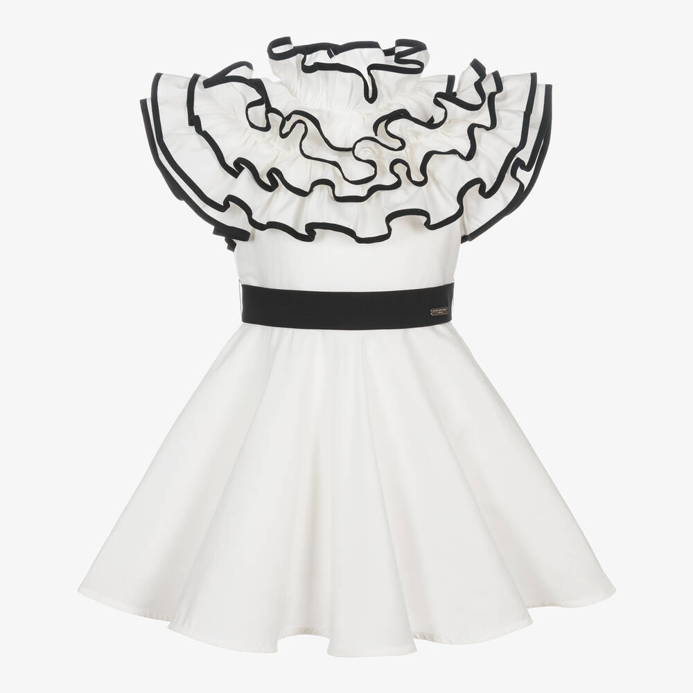 Ivory with black trims, this special occasion dress for girls is by Jessie and James London. Woven in a blend of cotton and hemp for a classic linen feel, this stunning design features layers of eye-catching ruffles which create an elegant high neckline. Lined in lightweight cotton with a back zip and button fastening, it has a contrasting black belt with a branded silver plate to finish.