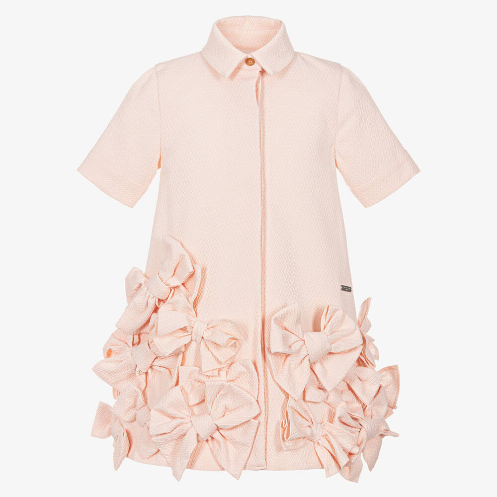 Pastel pink special occasion dress for girls by Jessie and James London. Styled with a collar and A-line shape, it has a simple design with statement bow appliqués around the hem. Hidden buttons fasten the piece and soft cotton lines it for comfort.
