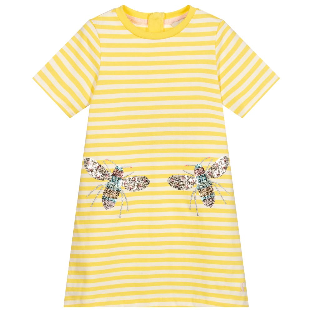 Yellow and white striped dress for girls by Joules, made in soft and stretchy cotton jersey. It has a colourful sequin bee motif on the chest. The ribbed neck is yellow and there is a yellow zip on the back. The brand's signature hare logo is embroidered at the hem in pink.