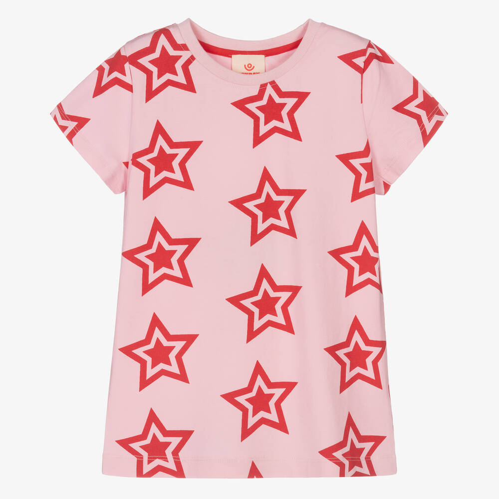 Pale pink cotton T-shirt for girls by British brand Joyday, exclusive to Childrensalon. Soft and comfortable, it is made in stretchy jersey with a fun red star print.