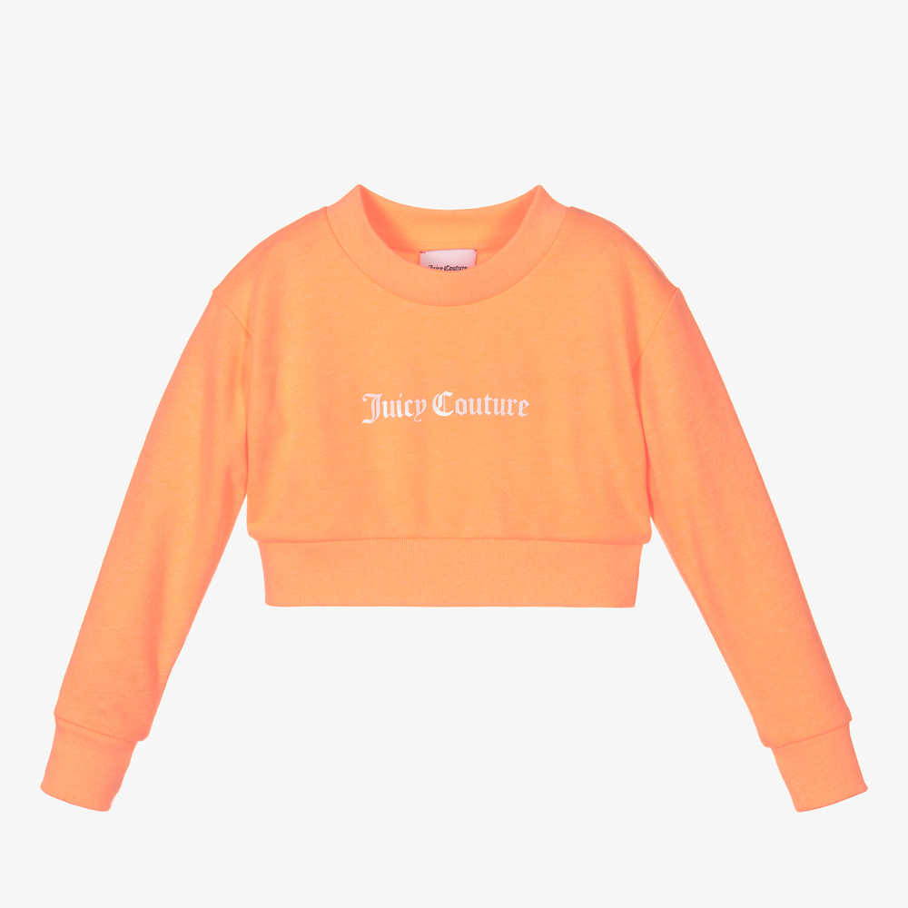 Cropped neon orange sweatshirt for girls from Juicy Couture, with a white rubberised logo print across the front. It is made in soft cotton-blend jersey.