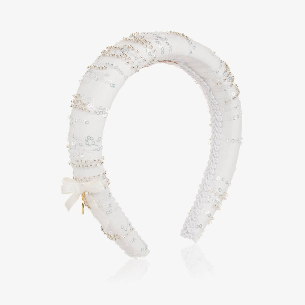 A white special occasion hairband for girls by Junona, beautiful for her dressed up look. Made with attention to detail, this stunning accessory is decorated with sparkly sequins and small silver beads. The flexible band is gently padded for extra height.