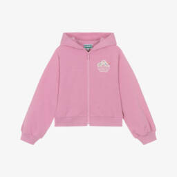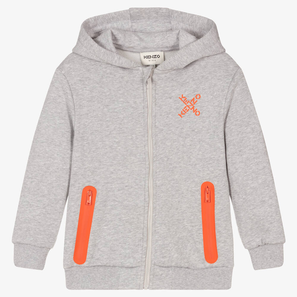 Grey marl zip-up top for boys by KENZO KIDS. Made in mid-weight cotton jersey, this hooded top has front pockets with contrast orange zip trims. The designer's X logo is printed on the front and back in orange.
