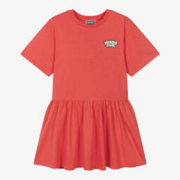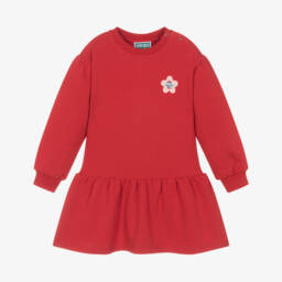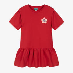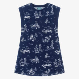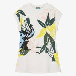 A lovely ivory dress for girls by KENZO KIDS, with fun ruffled short sleeves. Nautical inspired, the soft cotton weave has navy blue and red stitched stripes and small logos woven into the design, for a cool branded look. In a casual and relaxed style, the gathered skirt flares out from the empire waistline with discreet side seam pockets. The dress fastens with a concealed zip on the back for a neat finish.
