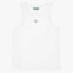 Pink and blue Mini-me racerback top for girls by Kenzo Kids, part of the brand's sports inspired Exclusive Edition capsule. Silky smooth and fitted, it is made in a fast drying and breathable technical jersey. It has a pink and red printed pattern with a rubberised logo on the front.