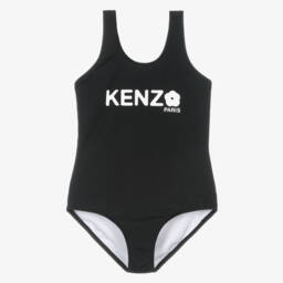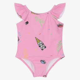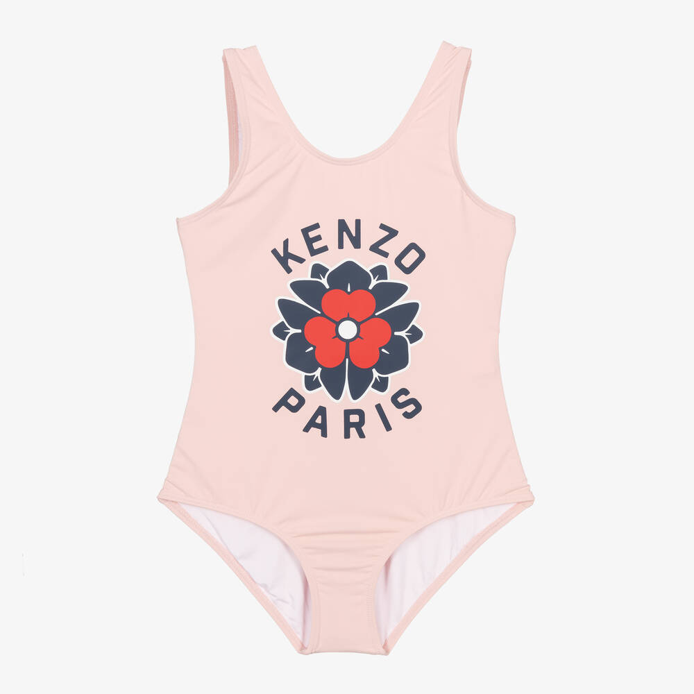 Pale pink swimsuit for girls, unmistakably by KENZO KIDS, with a large floral logo printed on the front in red, white and navy blue. Ideal for the beach or pool, it is soft and silky with a scooped back design and a comfortable lining.
