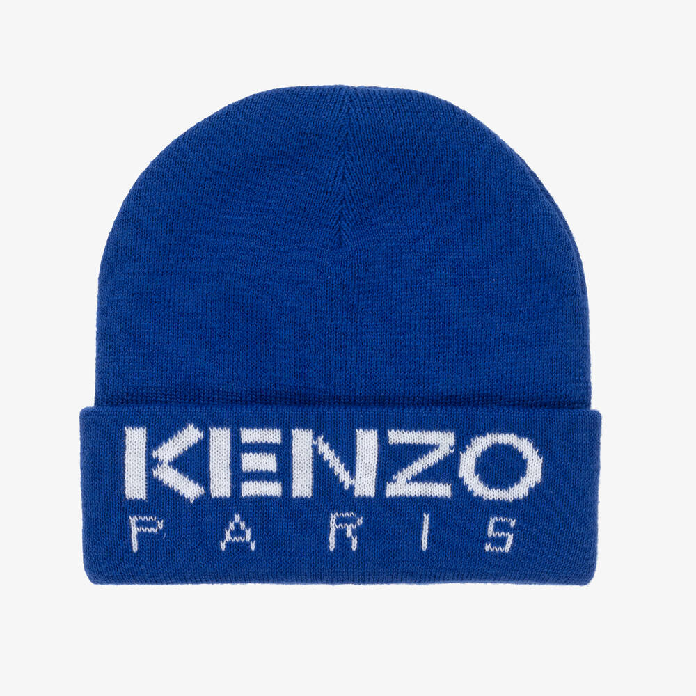 Royal blue beanie hat for boys and girls by KENZO KIDS, made in a soft and stretchy knit. Simply styled, this signature hat has a distinctive white logo design on the turned-up brim.